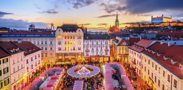 Bratislava, die faszinierende Hauptstadt der Slowakei, lockt Reisende mit ihrem reichen Wandteppich der Geschichte, der lebendigen Kultur und der köstlichen Küche. Von der mittelalterlichen Altstadt bis zu ihren modernen Wolkenkratzern verbindet Bratislava nahtlos das Alte und Neue und schafft eine bezaubernde Atmosphäre, die Ihre Sinne mit Sicherheit fesselt. Tauchen Sie in das Herz von Bratislavas historischem Charme, indem Sie die labyrinthischen Straßen der Altstadt erkunden. Lassen Sie sich von Ihren Fußstapfen durch schmale Kopfsteinpflasterbahnen, an Barock-, Gotik- und Renaissance -Gebäuden führen und versteckte Juwelen wie die St. Martin's Cathedral, ein Meisterwerk der gotischen Architektur, aufdecken. Bratislavas Kulturszene ist so lebendig wie seine Geschichte. Wagen Sie sich in die Bratislava National Gallery, wo Sie einen Schatz der Kunst auf Jahrhunderte begegnen. Tauchen Sie in die Theaterszene der Stadt ein und fangen Sie eine Aufführung im slowakischen Nationalen Theater oder im Reduta Theatre. Egal, ob Sie historische Erkenntnisse, kulturelle Erfahrungen, kulinarische Abenteuer oder ein lebendiges Nachtleben suchen, Bratislava verspricht eine unvergessliche Reise. Lassen Sie sich vom Charme der Stadt fesseln und entdecken Sie die Schätze, die in ihren Mauern warten.